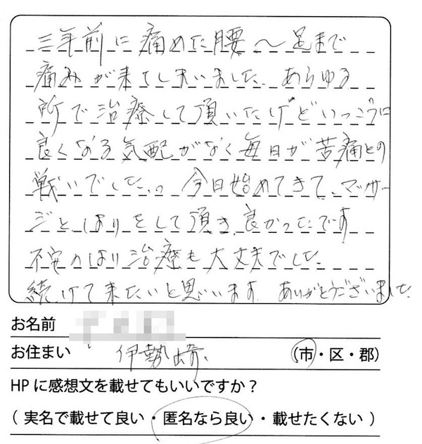 主訴:腰から足にかけての痛み 三年前に痛めた腰〜足まで 痛みが来てしまいました。あらゆる 所で治療をしていただいたけどいっこうに 良くなる気配が無く毎日が苦痛との 戦いでした。今日初めてきて、マッサージ とはりをして頂き...