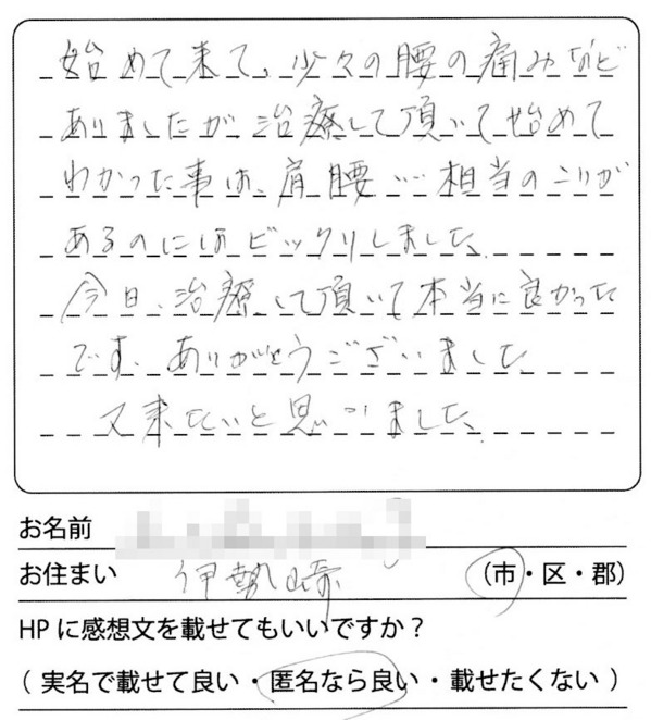 HOME > 患者さまの声 > 肩こり施術の感想 > 伊勢崎市 気付かぬコリにびっくり